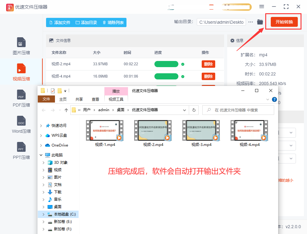 第五步:压缩完成后,软件会自动打开输出文件夹,其中存放着压缩后的视频文件。我从下图可以看出,原文件与压缩后文件的大小,可明显看到体积减小。此时可播放视频,检查画质是否符合预期。